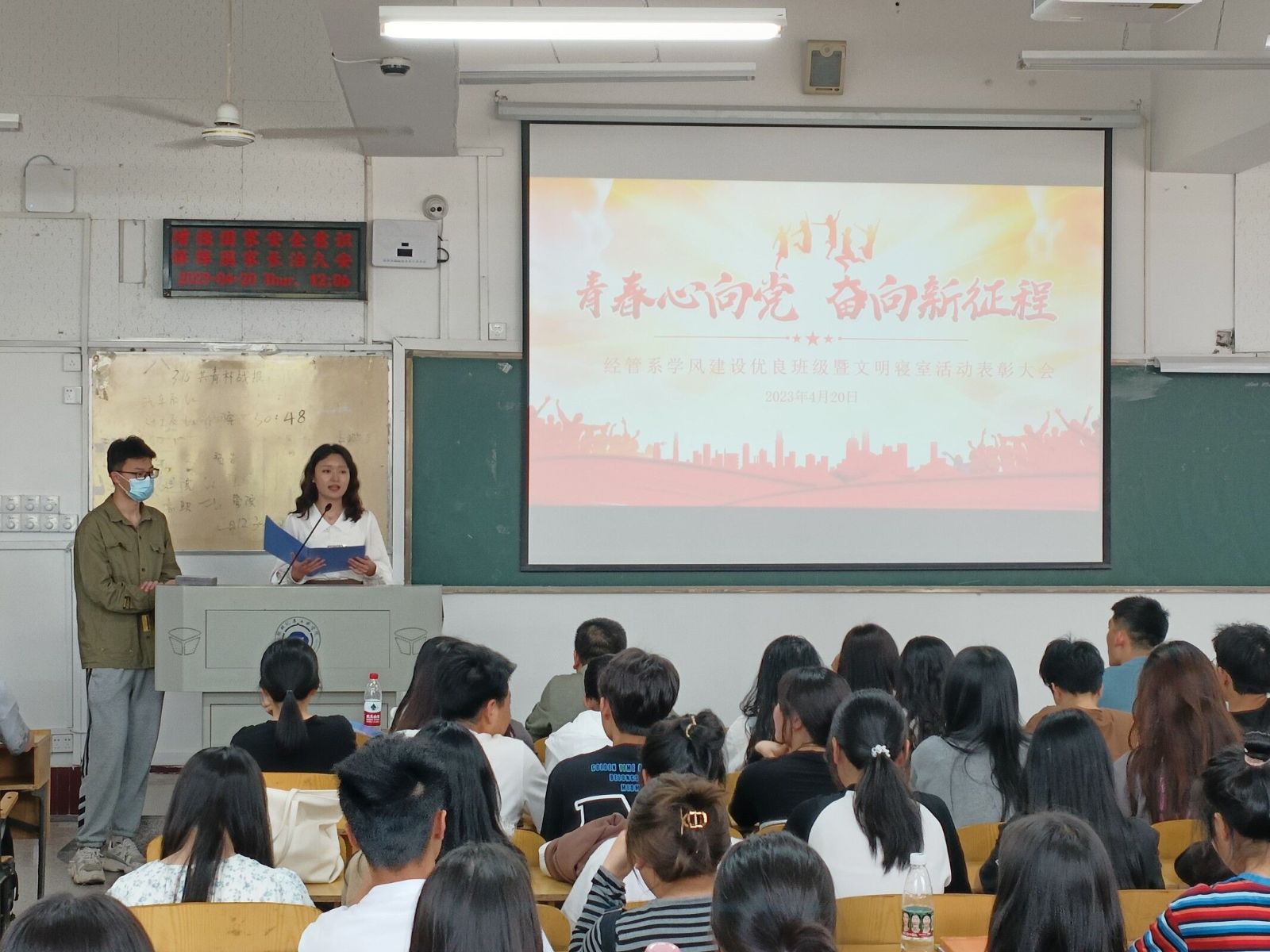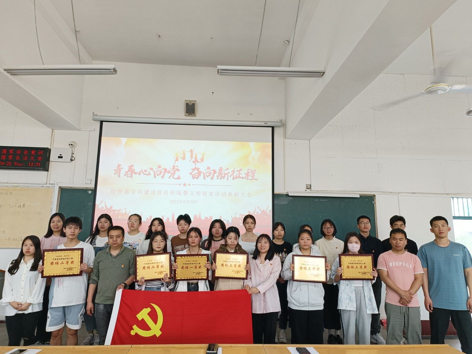为进一步强化学风建设,营造良好的育人环境,经济管理系在三月开展“学风建设月”系列活动,结合“六有”服务型党支部建设之际,员工党员下沉班级抓班风、促学风。4月20日,我系于2204教室召开“学风建设优良班级”及“文明寝室”表彰大会。出席会议的有经济管理系办公室主任贺茂、团委书记陈名凤、辅导员罗珍、聂正邦、王淑君、赵志恒及获奖代表、各班员工代表。