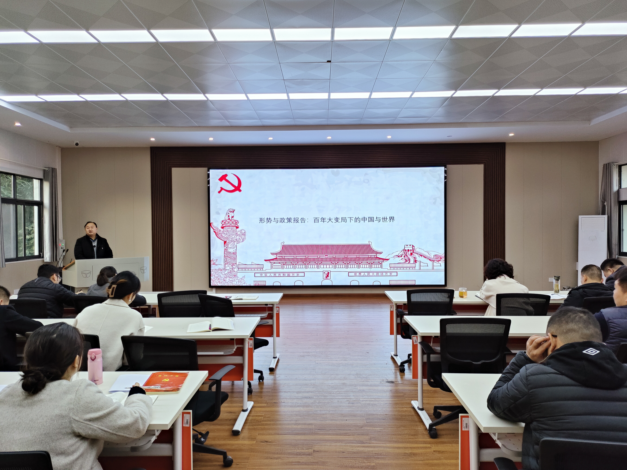 习近平总书记指出,“当前中国处于近代以来最好的发展时期,世界处于百年未有之大变局,两者同步交织、相互激荡”。为了更好的激励党员同志在时代发展大势中奋发有为,11月14日下午,分党委书记陈雪刚讲授《百年大变局下的中国与世界》专题党课。教工支部全体党员参会,会议由支部书记聂正邦主持。